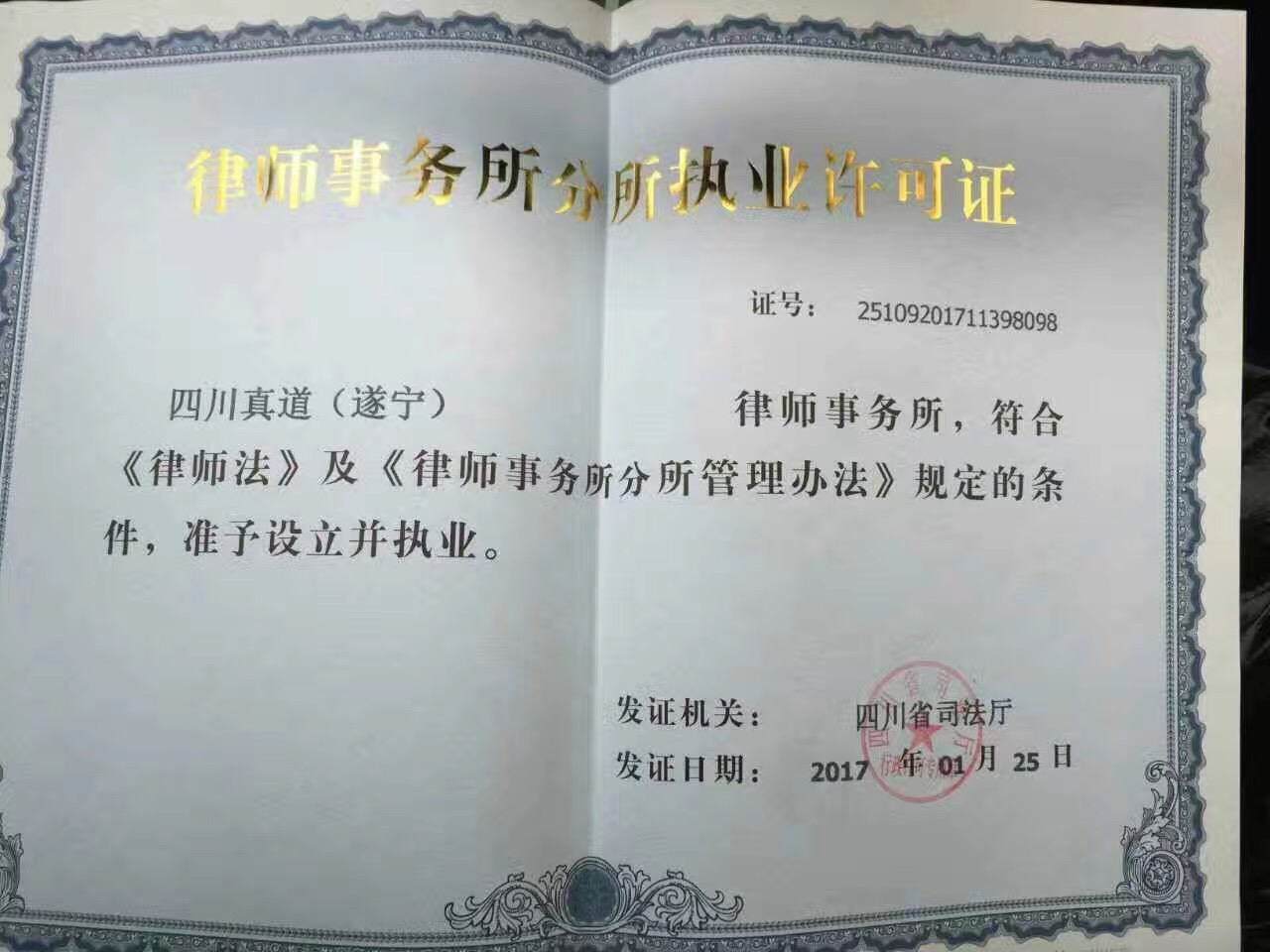 热烈祝贺四川真道(遂宁)律师事务所于2017年1月25日通过四川省司法厅审核予以设立!经过风雨六载真道再攀高峰,是真道所和真道人的喜事,我们作为真道人倍感自豪!