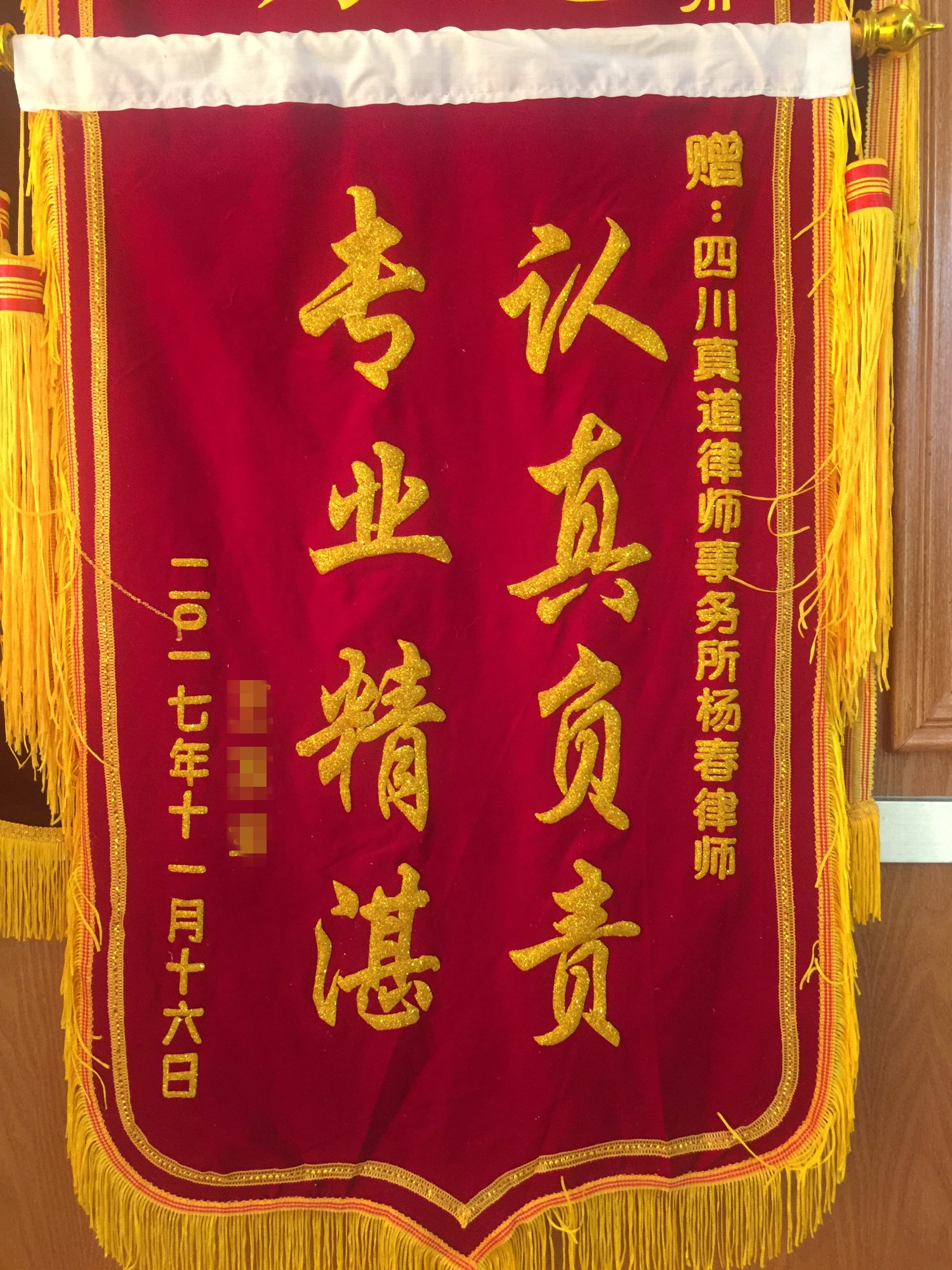 2017年11月30日下午,由我所副主任杨春律师承办的王某涉嫌贩卖毒品罪一案中被告人王某家属专程来到我所,将一面写有“认真负责,专业精湛”的锦旗送至杨春律师手中,以表达其感激之情。