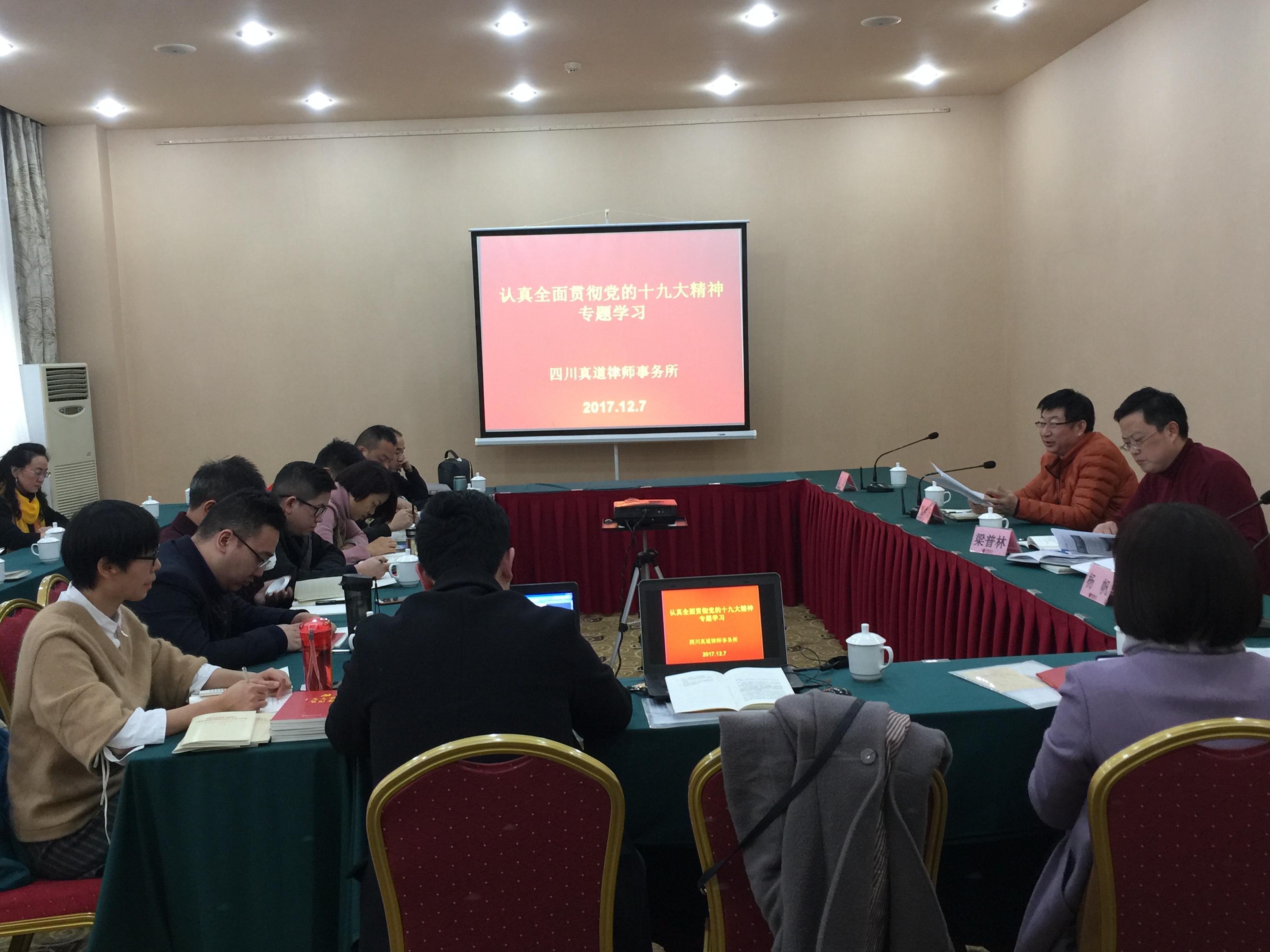 2017年12月7日下午14点30分,我所在东津酒店六楼会议室举行关于全面贯彻党的十九大精神专题学习座谈会。我所主任梁普林同志作为绵阳市党代会代表,根据党代表任期制试点工作有关规定,为充分发挥党代表示范引领、服务大局、监督落实的作用,结合工作实际,深入学习贯彻党的十九大精神,组织全所研究十九大精神。本次会议邀请到了前游仙司法局局长、现区人大环治委主任魏洪奇先生作为开讲嘉宾。